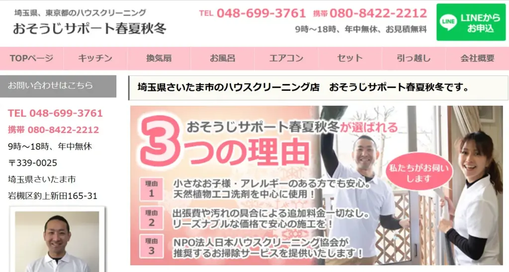 | 主な対応サービス | エアコン・水回りなどのハウスクリーニング、全体清掃 |